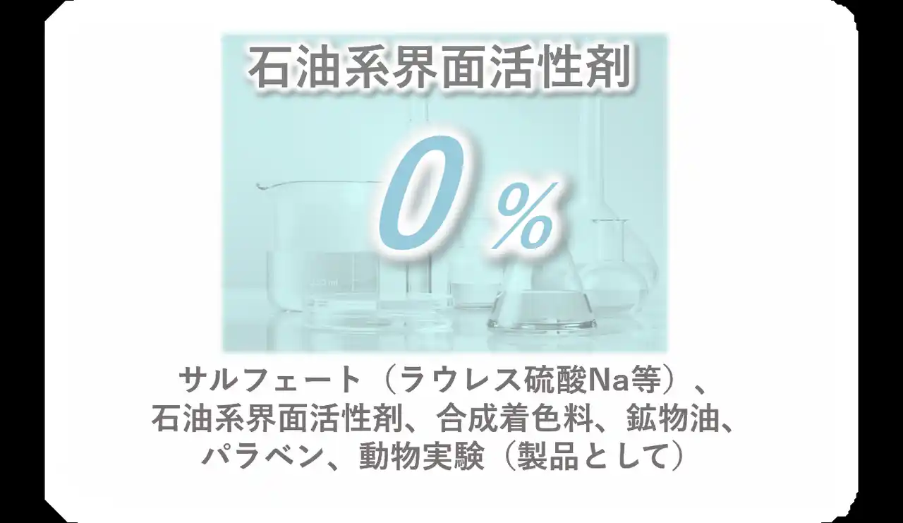 オレフィン(C14ー16)スルホン酸Naなどの石油系洗浄成分をはじめ、6つの無添加・フリー処方で頭皮や髪にやさしい処方を追求しました。 |