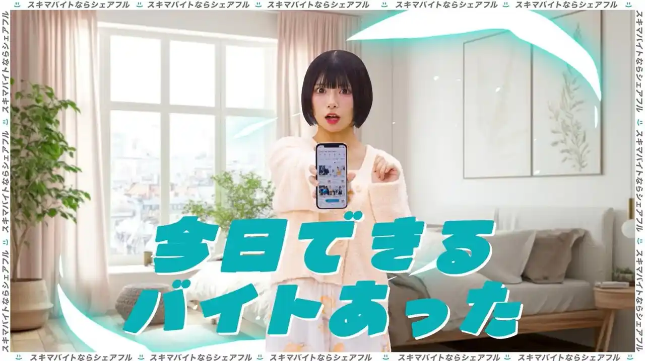 「スキマバイトなら、シェアフル!」というキャッチーなメッセージを通じて、面接・履歴書不要、アプリひとつで仕事が見つかる魅力を明るく伝えています。 |