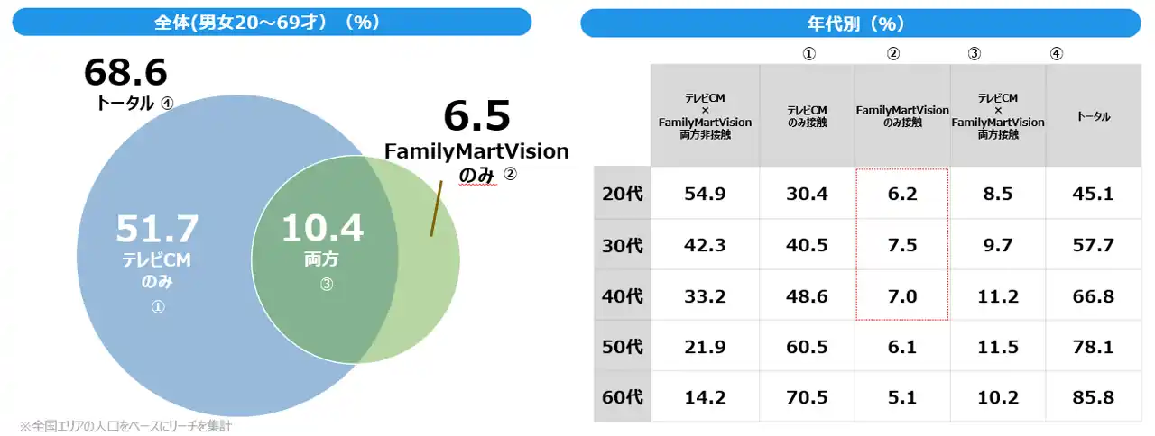 テレビCM単独での接触(テレビCMのみ)が51.7%、テレビCMとFamilyMartVisionの両方接触(両方)が10.4%となり、FamilyMartVisionのみの接触は6.5%と、インクリメンタルリーチの獲得が確認できました。リーチ力が強いと言われるテレビCMと同時に放映した場合においても、FamilyMartVisionのインクリメンタルリーチがしっかり取れていることがわかります。今までの検証結果と同様に、年代別のリーチを見ると若年層でのその傾向が強く、テレビでは届きづらい若年層へのアプローチの有効性が確認できました。 |