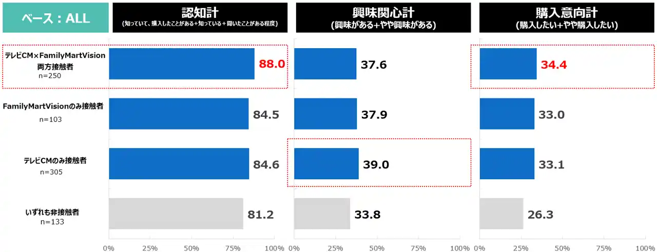 また、「FamilyMartVisionのみ接触者」においては「テレビCMのみ接触者」とほぼ同等の効果を確認できました。 |