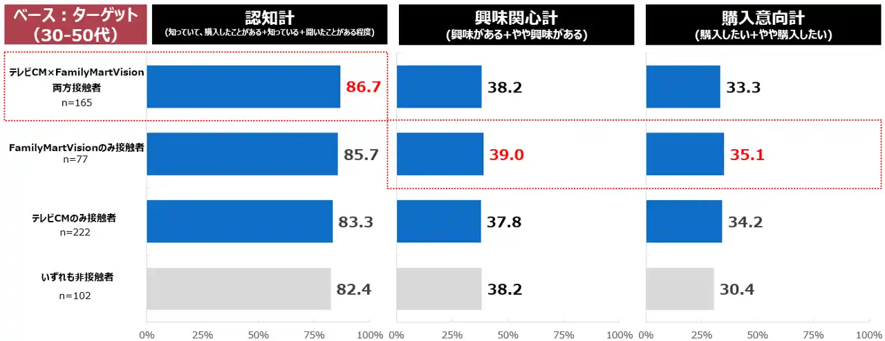 さらに、ターゲット条件の一つである「30-50代」に絞って上記データを検証すると、「認知計」ではベース:ALLと同様に「両方接触者」がトップスコアですが、「興味関心計」「購入意向計」においては「FamilyMartVisionのみ接触者」がトップスコアとなり、FamilyMartVision単独の接触でも十分に高い効果が得られることがわかりました。 |