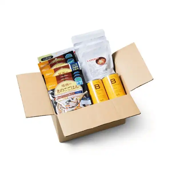 年3回送られる「食べとくエコBOX」のうち、1回分が「非常食BOX」に変更されるコースです。「非常食BOX」はご飯やパンなど、賞味期限1年以上の保存食を厳選し、5,000円相当分をお届けします。食べとくコースと同じ料金で、年3回配送のうち1回が「非常食BOX」に切り替わります。もしもの備えを手軽に始められる、お得で安心なコースです。 |