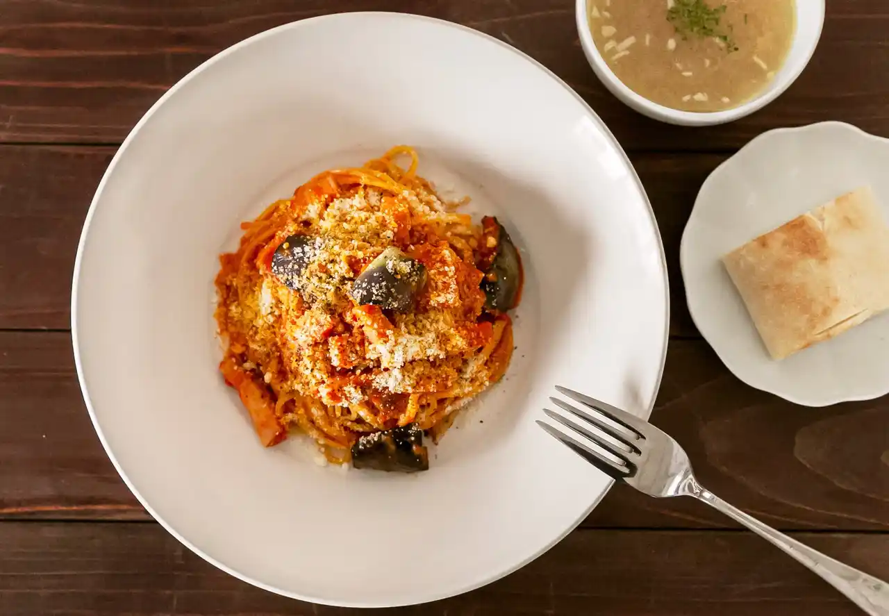 トマトの酸味とクリームのまろやかさがおいしい濃厚なトマトクリームソースのパスタ。カリッと焼いたベーコンと、とろける食感の揚げなすが相性抜群です。 |
