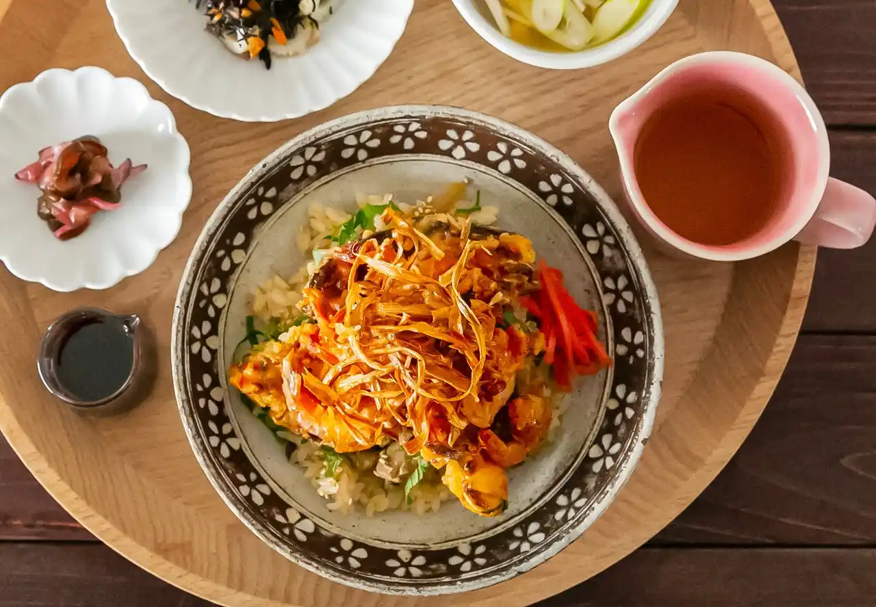 鶏肉の旨みとごぼうの食感が楽しめる「鶏ごぼうごはん」に、サクサクのエビのかき揚げをトッピングしました。そのままかき揚げ丼としても、お好みで別添えのだし汁を注いでお茶漬けとしても楽しめます。 |