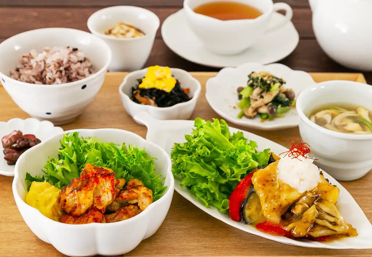 メインのおかずから2品と、副菜2品、ごはん(白米または雑穀米)、みそ汁、香物、ミニデザート1品、ドリンクのセットです。 |