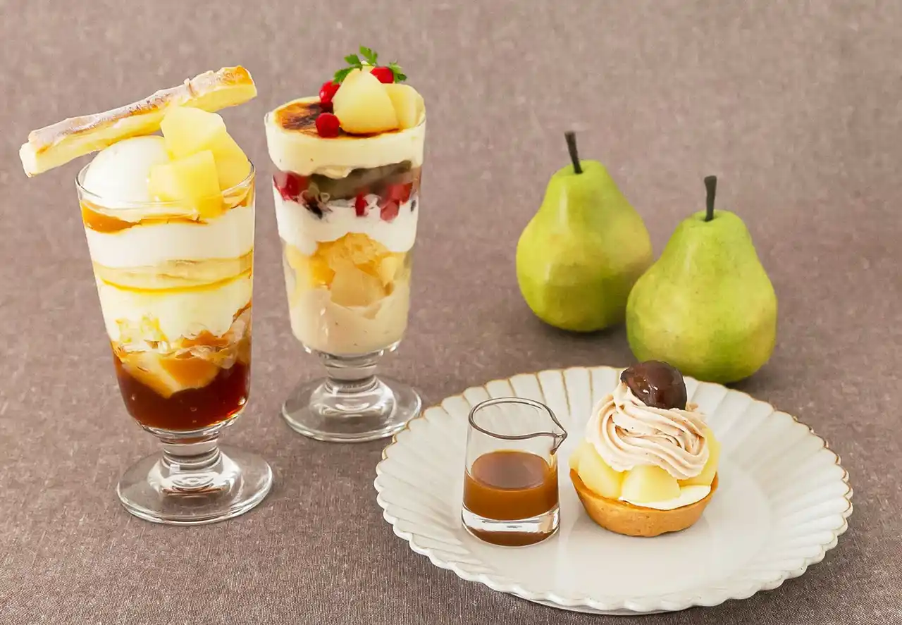 左から「洋なしとキャラメルのパフェ」「洋なしとほうじ茶のパフェ」「洋なしと栗のタルト」 |