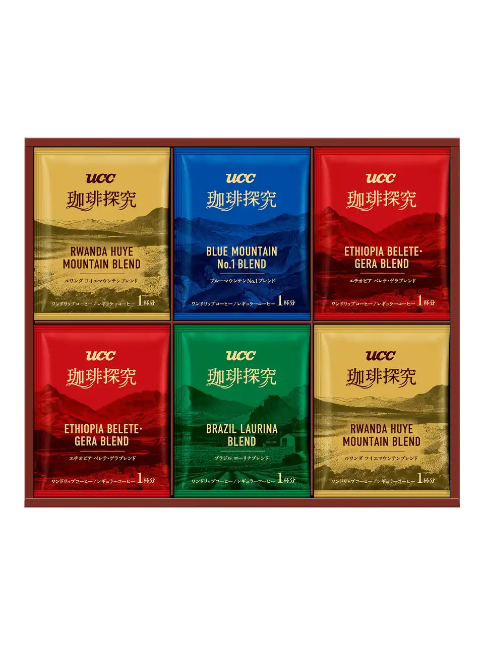 ■『UCC 珈琲探究』から、ギフト限定のブレンド ■多彩なフレーバーを楽しめる、豊富なラインアップ ■新開発のオリジナルドリッパーを採用 ・1杯10g使用なので、マグカップでもたっぷり楽しめる ・広口でお湯が注ぎやすい ■コーヒー鑑定士監修、アラビカ豆100%使用 ■味覚 ・ブルーマウンテンNo.1ブレンド:甘みのあるコク、フルーティな後味が感じられる味わい ・ブラジル ローリナブレンド:フルーティな風味と爽やかな酸味がバランスよく調和した味わい ・エチオピア ベレテ・ゲラブレンド:明るい酸味と、はちみつのような甘い余韻が続く味わい ・ルワンダ フイエマウンテンブレンド:グリーンアップルのような爽やかな風味と、甘みのある味わい |