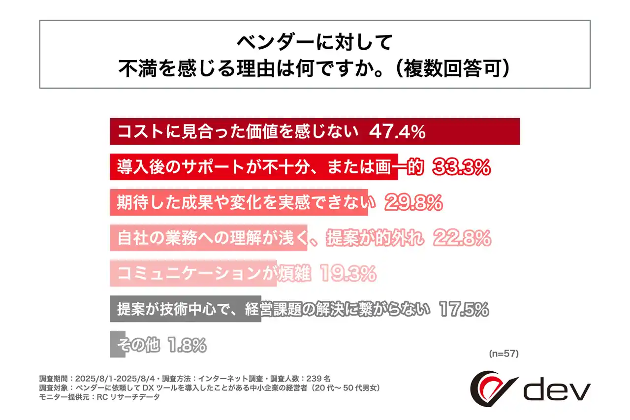 株式会社dev(本社:長野県松本市、代表取締役:浅田 佑介)は、ベンダーに依頼してDXツールを導入した中小企業の経営者を対象に「DX推進におけるベンダー選定とツール導入後の実態」に関する調査を実施しました。この調査から、DXツールをベンダーに依頼して導入した中小企業の経営者のDXツールを導入した目的、ベンダーの選定基準、DXツール導入後の課題などが明らかになりました。 |