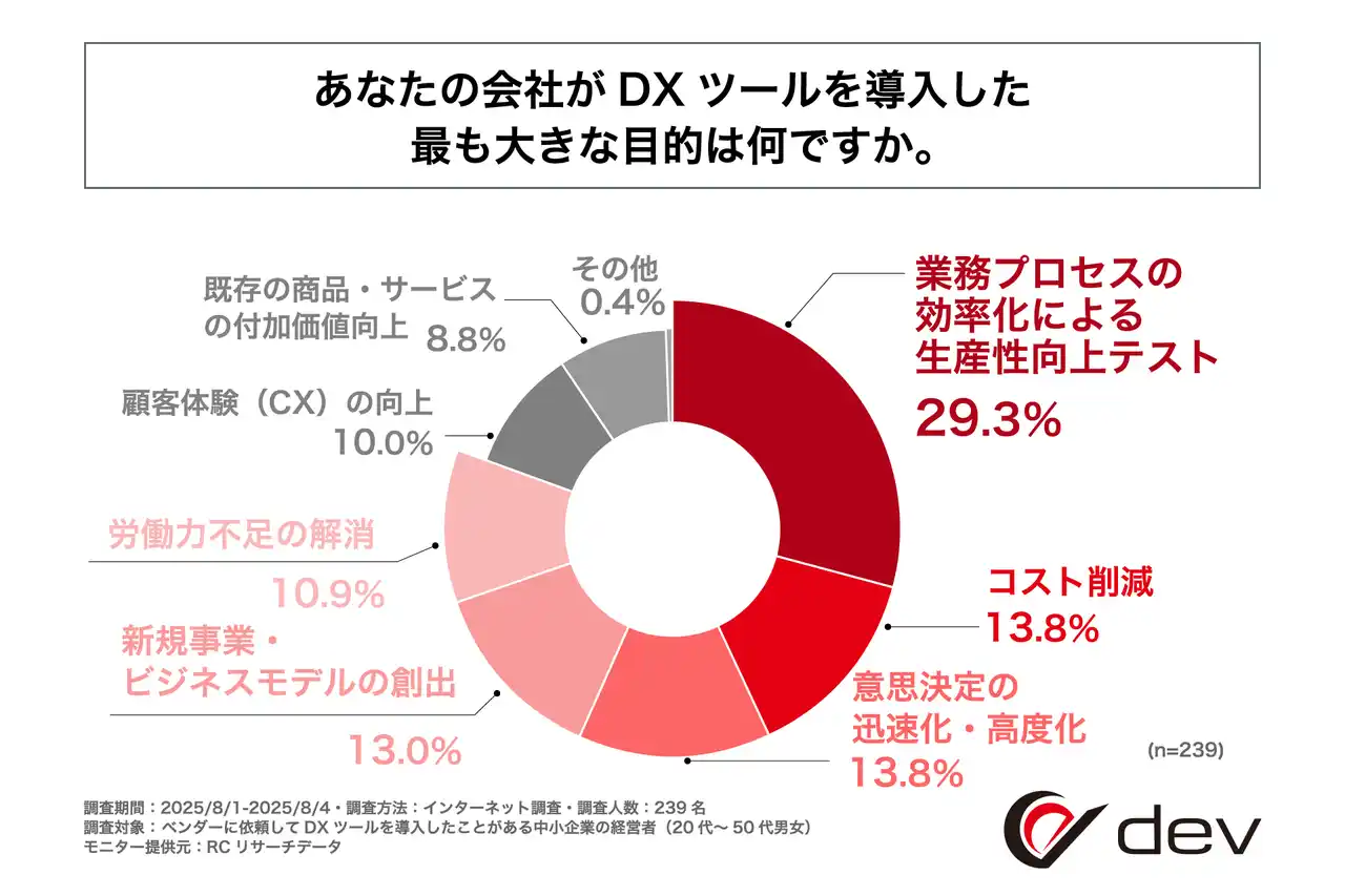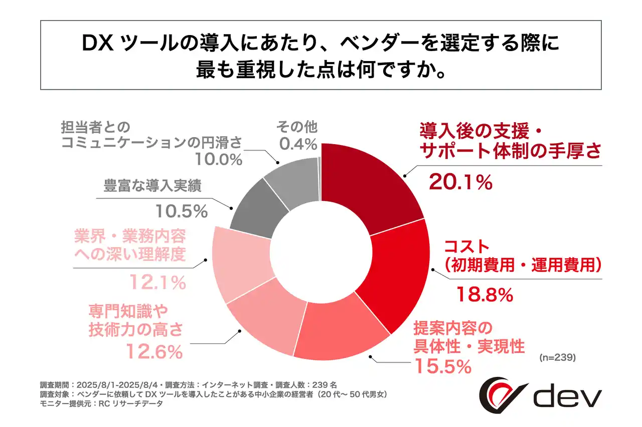 株式会社dev(本社:長野県松本市、代表取締役:浅田 佑介)は、ベンダーに依頼してDXツールを導入した中小企業の経営者を対象に「DX推進におけるベンダー選定とツール導入後の実態」に関する調査を実施しました。この調査から、DXツールをベンダーに依頼して導入した中小企業の経営者のDXツールを導入した目的、ベンダーの選定基準、DXツール導入後の課題などが明らかになりました。