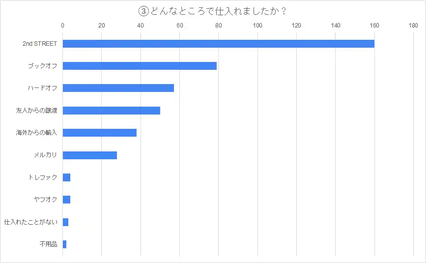 | 調査によると、最も多く選ばれた仕入れ先は「2nd STREET」(159票)でした。フリマアプリやネット取引が盛んな今でも、実はリアル店舗派が多数という結果です。 | ||||||||||||||||||||||||