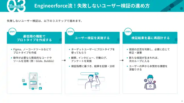 | Engineerforceでは、この課題を解決するため「ユーザー検証に最適なプロトタイプ手法」と「失敗しない検証プロセス」を体系化しました。 | |||