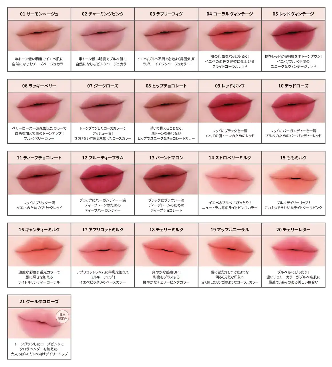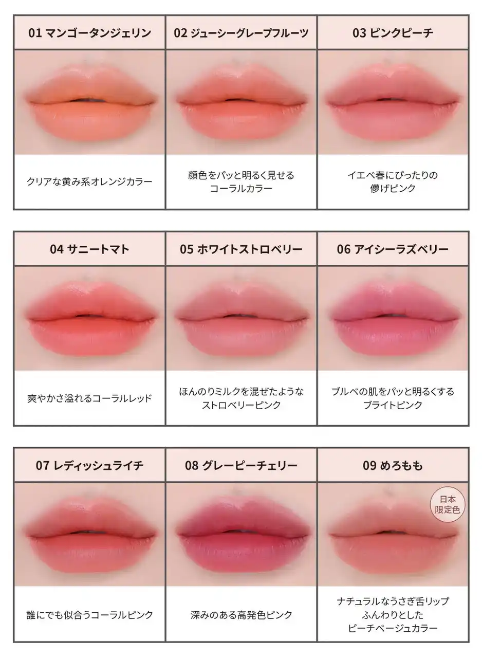 時間が経ってもくすまず、メイク直後の色鮮やかさがずっとつづくから、メイク直しがむずかしい日にも頼れる1本です。 日本限定色を含む全9色展開で、その日の気分にも肌トーンにもぴったりのカラーが見つかります。 |