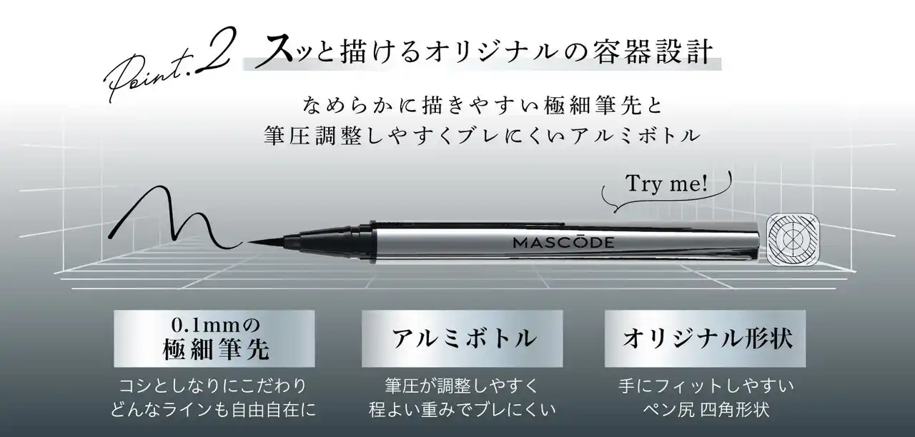 株式会社サン・スマイル(本社:東京都港区/代表取締役社長:田中徳也)が展開する『MASCODE(マスコード)』は、初のビューティーラインとして『スリークリッキッド アイライナー』を発売いたします。8月30日(土)※1全国のロフト※2およびロフトネットストア、全国のPLAZA※2およびPLAZAオンラインストア、全国のアットコスメストア※2、公式オンラインストアにて先行発売、10月1日(水)一般発売いたします。