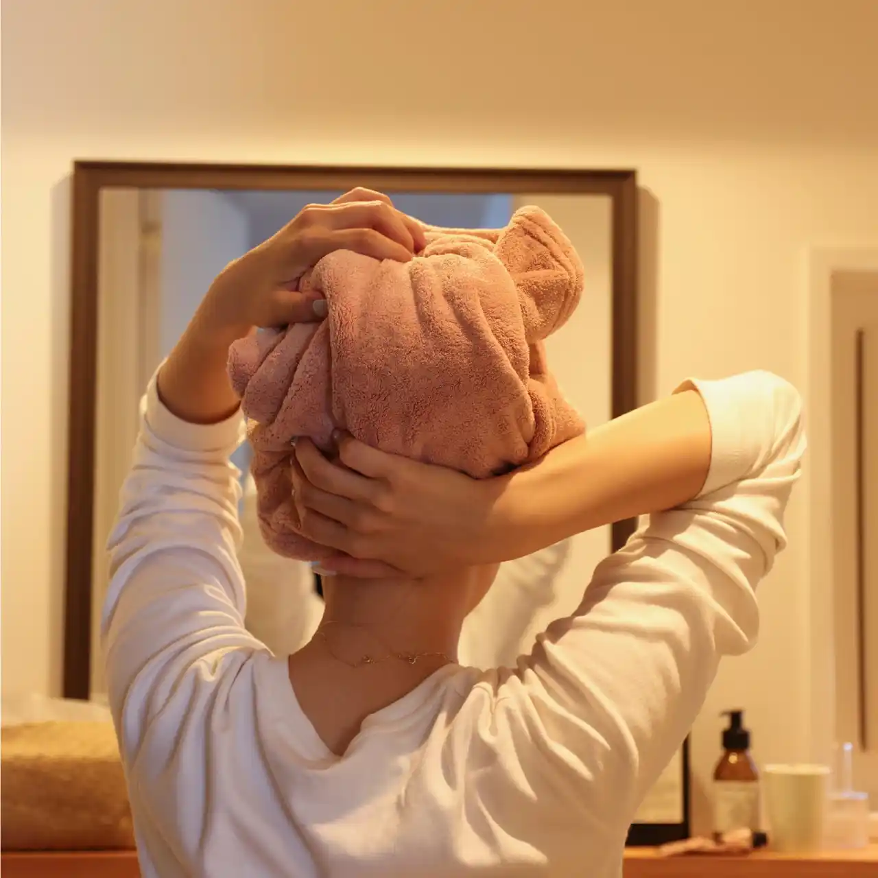 タオルドライだけで余分な水気を取り除き、ドライヤー時間も短縮できます。 |