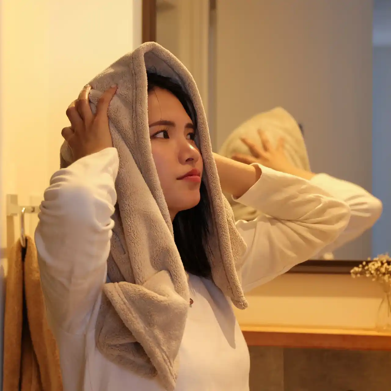 吸水力は綿タオルの5倍。濡れた髪にそっと当てるだけ |