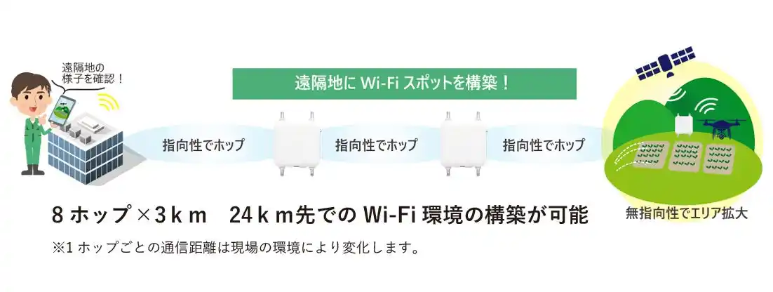 屋外メッシュWi-Fiソリューション「SE-0611E」の特に際立った強みである長距離性能がマッチ! |