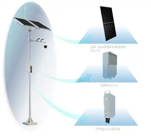 電源の確保が難しい場所でも、ソーラーパネル付きのスマートポールを活用することで、監視カメラシステムを構築できます。高性能な蓄電システムがセットされているため、365日24時間途切れることなく稼働が可能です。このシステムは、河川の監視や農業DXなど、幅広い分野で役立ちます。 |