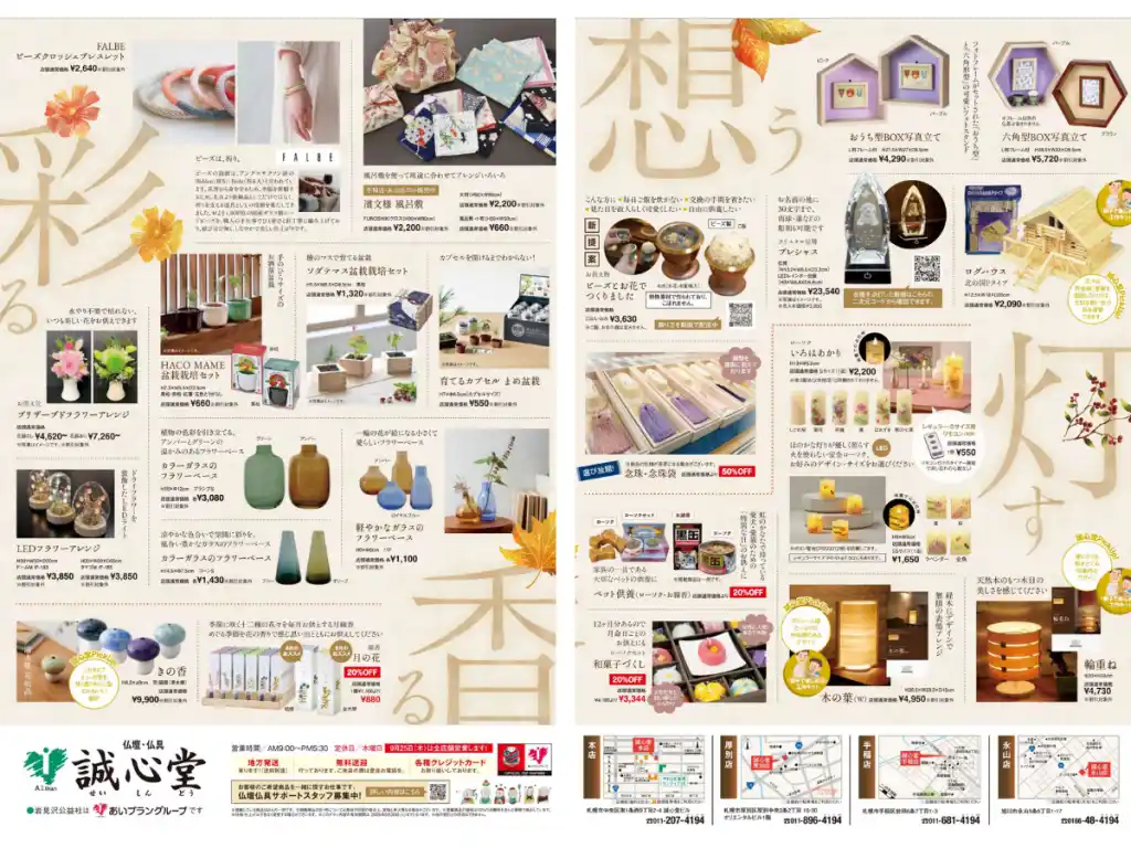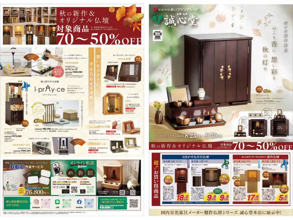 | 株式会社あいプランが運営する仏壇仏具店「誠心堂」では、2025年8月23日(土)から9月30日(火)までの期間、全店にて「秋のお彼岸特集」を開催いたします。 | ||||||||||||