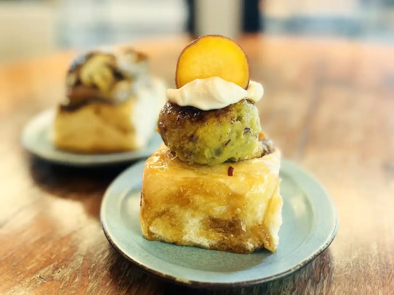 満月スイートポテトロール 650円(税込) スイートポテトと大学芋の2つの美味しさを一度に楽しめる、贅沢な一品です。ロールパンにしっとり濃厚なさつまいもペーストを乗せ、あまじょっぱいみたらしソースをかけてキャラメリゼしました。仕上げに、満月をイメージした大学芋をトッピングしました。 |