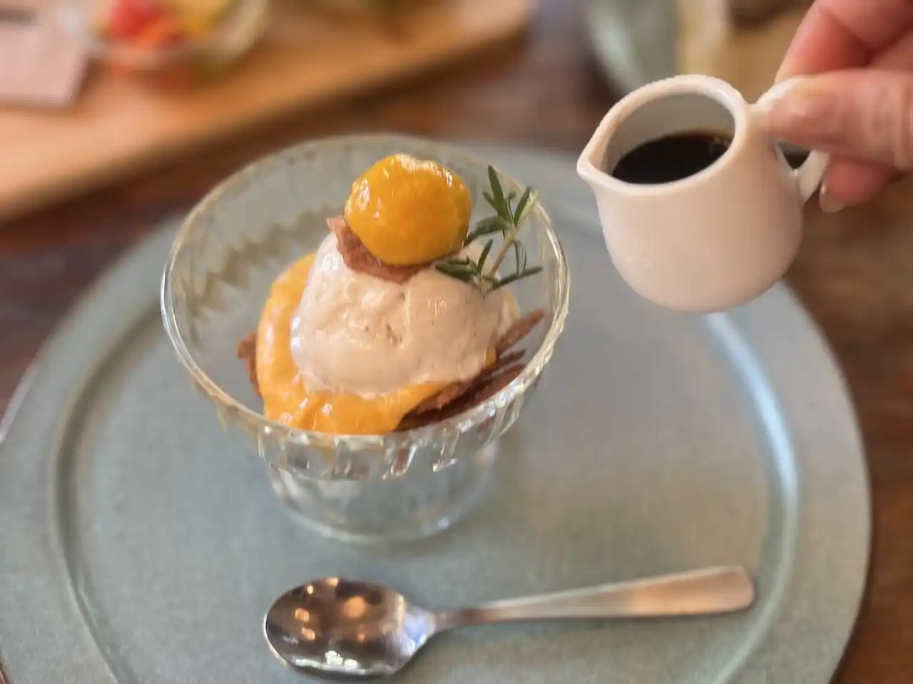 ムーンライト・サンデー 650円(税込) 満月のように輝くかぼちゃの白玉が「とろ~り」とろける、食後のデザートにもおやつにもぴったりなサンデーです。ほんのり甘い黒蜜と、ひんやりなめらかな「SOYSCREAM!!!」(※)のクリーミーバニラアイスが重なり、やさしい「和」の風味が口いっぱいに広がります。さらに、特注したコーンの「カリッ」とした香ばしさと軽快な食感が心地よいアクセントです。 |