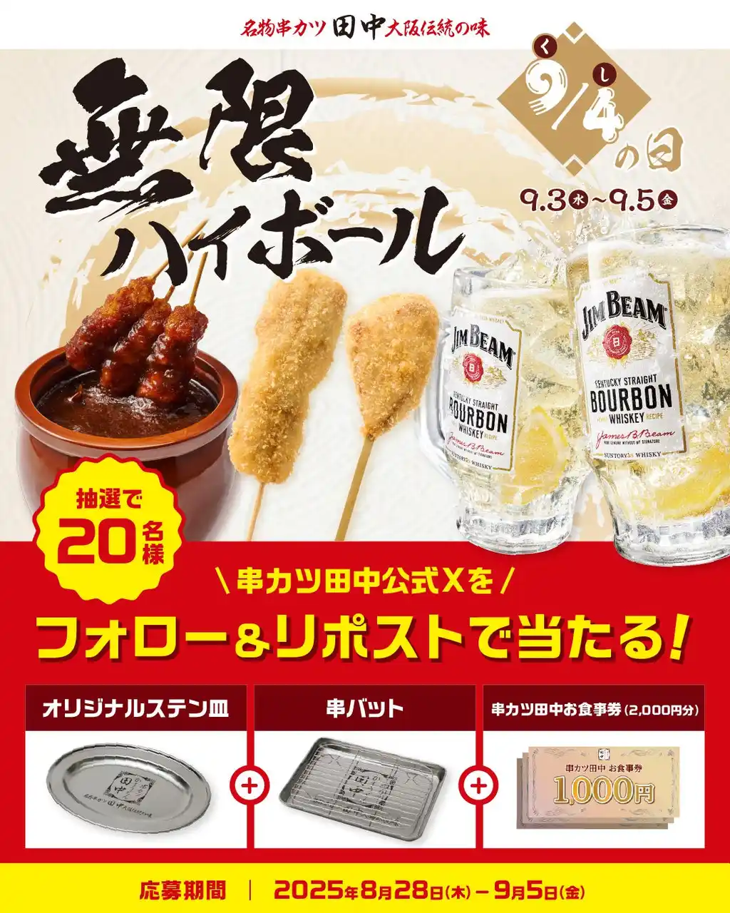 8月28日(木)~9月5日(金)の期間で、串カツ田中のX公式アカウントをフォローして、該当の投稿をリポストすると、抽選で20名様に「オリジナルステン皿」・「串バット」・「お食事券2000円分」をプレゼント! |