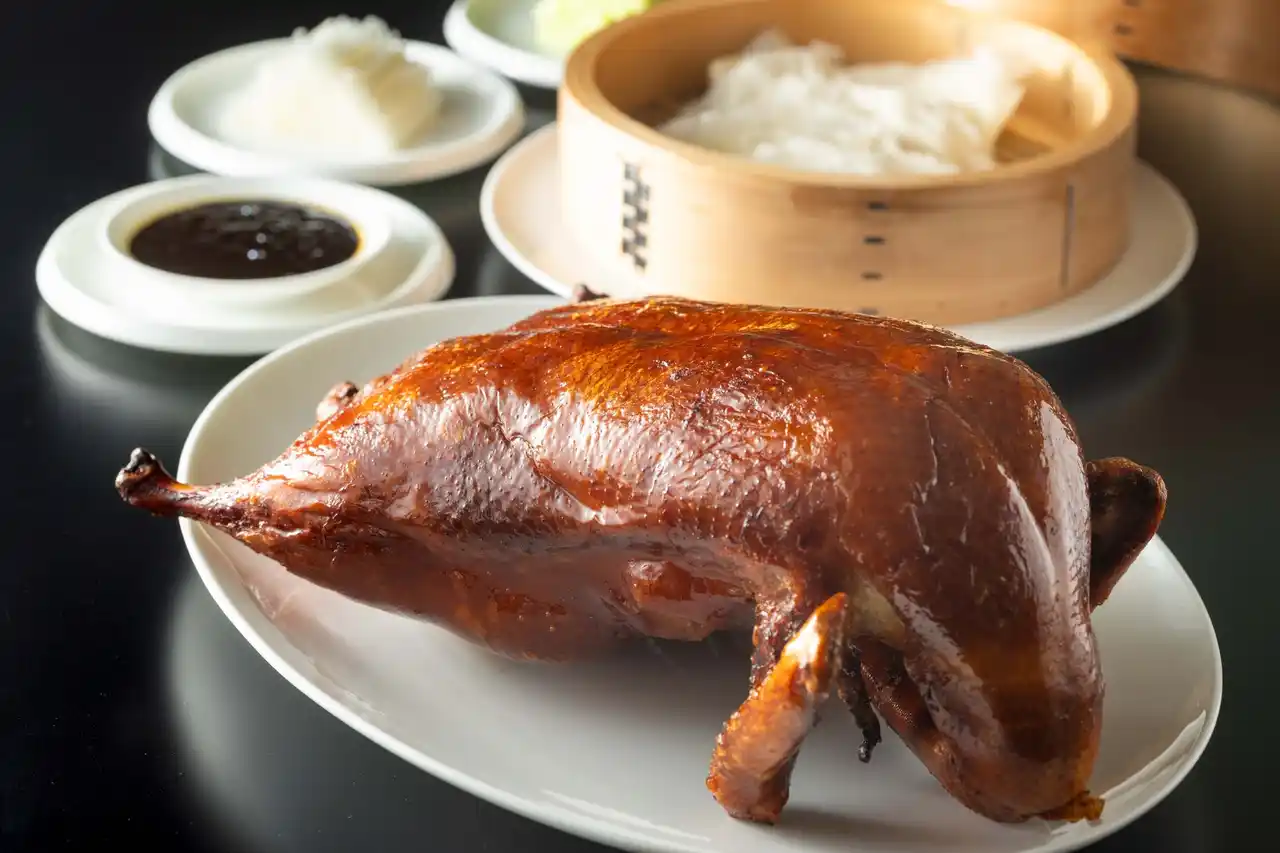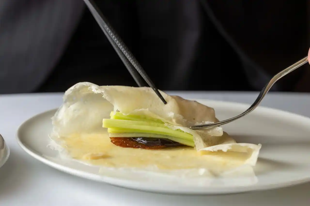 北京ダックは、ゲストの目の前でカッティングするワゴンサービスにて、出来たてを何度でもおかわりできる食べ放題スタイル。さらに、北京ダックの香ばしい皮を包む生地 “薄餅(ポーピン)” は、職人がテーブル脇で一枚ずつ丁寧に焼き上げ、あつあつの状態でご提供。透けるような薄さながらも、芳ばしくもちもちとした食感が、北京ダックの味わいを一層引き立てます。 |