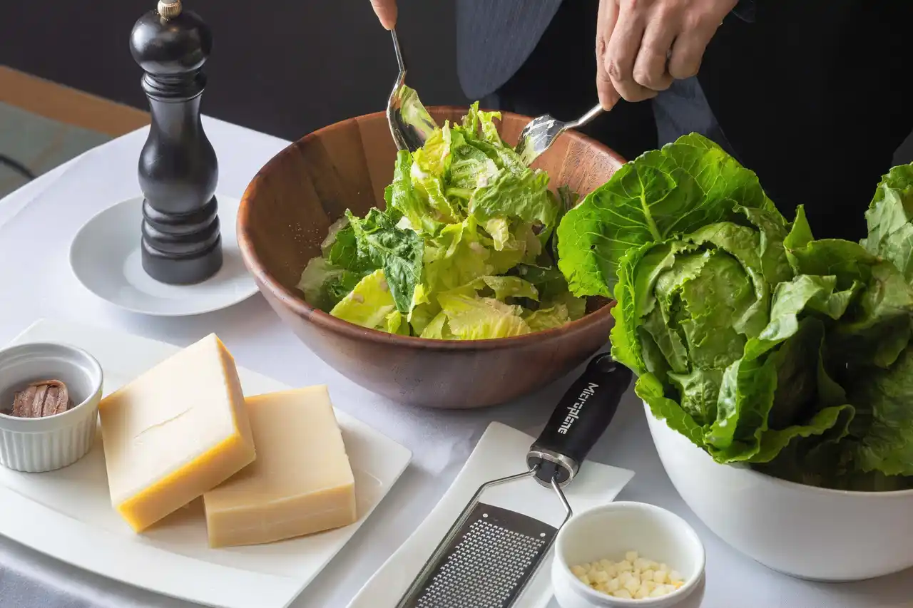 魅力のひとつは、旧キャピトル東急ホテル時代より継承されてきたシーザーサラダのテーブルサイドパフォーマンス。専任スタッフがゲストの目の前で仕上げる演出は、出来立ての香りや音、彩りの変化までも楽しめる、五感で体感する特別なひとときです。 |