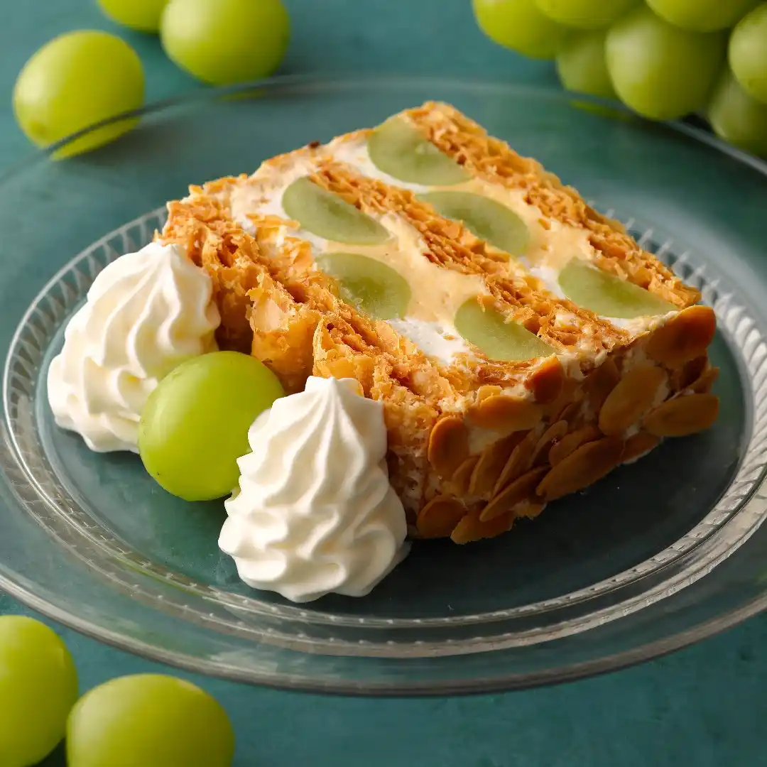 クレープとカプレーゼに代わって、キハチの定番ナポレオンパイを旬のシャインマスカットでアレンジした「KIHACHIのシャインマスカットパイ」をフルサイズで楽しめるスペシャルバージョンです。 |