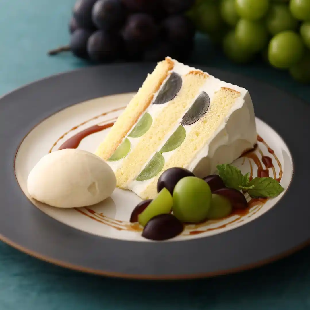 フレッシュのシャインマスカットと巨峰を生クリームとスポンジでサンドしたシンプルなショートケーキ。バニラアイスを添えて。 |