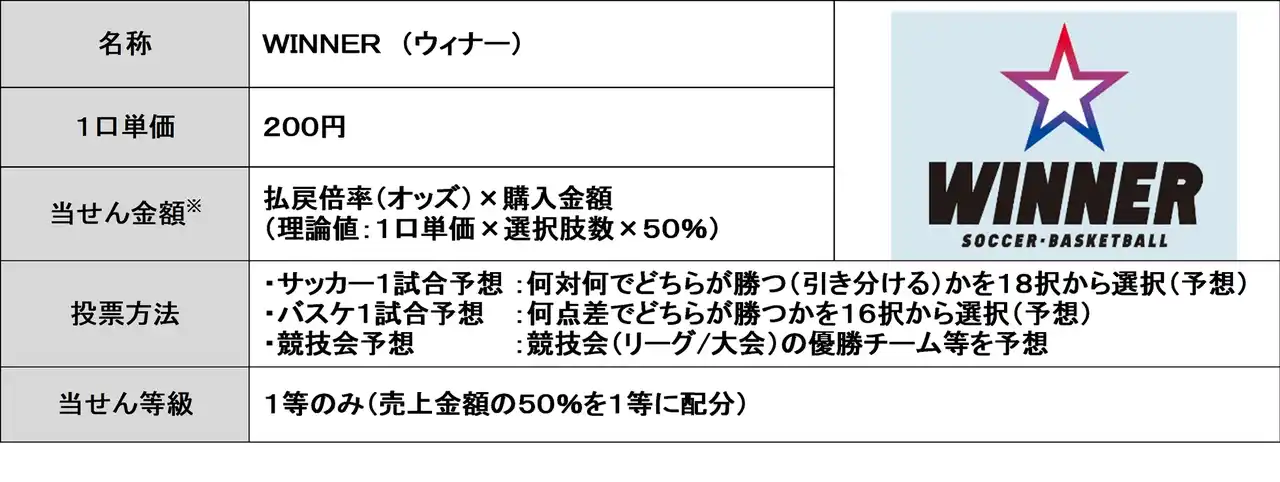 「WINNER」の売上の一部は、スポーツ振興のための助成金として活用されることに加えて、Jリーグや B.LEAGUEのクラブチームに還元され、選手等のための環境整備やクラブ強化などに充当されます。 |