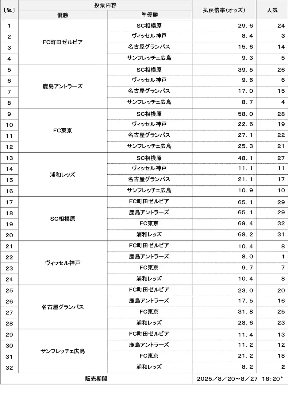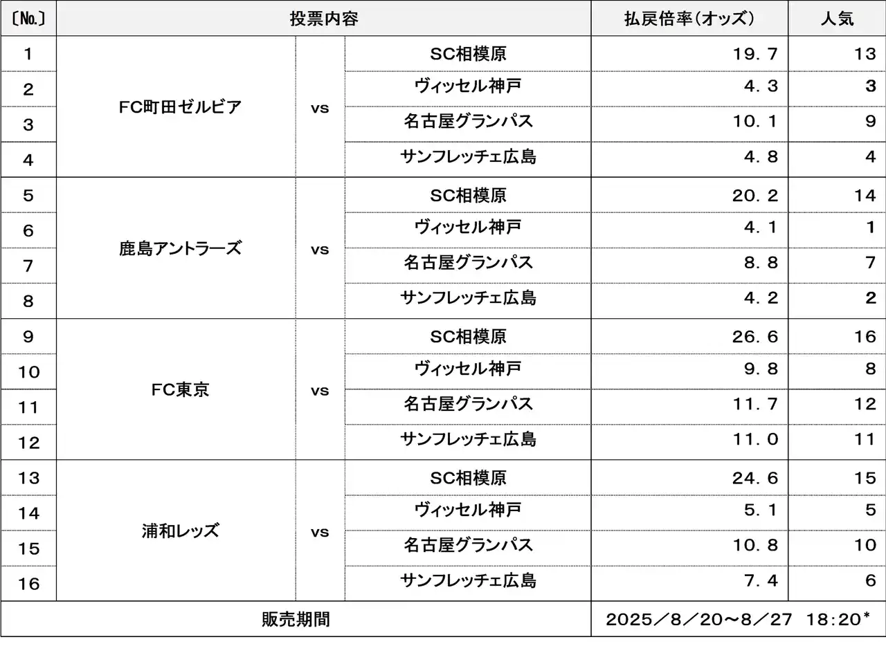 ※1 8月26日(火)10時時点の投票状況となります。払戻倍率(オッズ)は、投票状況により販売終了まで変動します。払戻倍率(オッズ)は、スポーツくじオフィシャルサイト(https://www.toto-dream.com/)で随時更新しています。 |