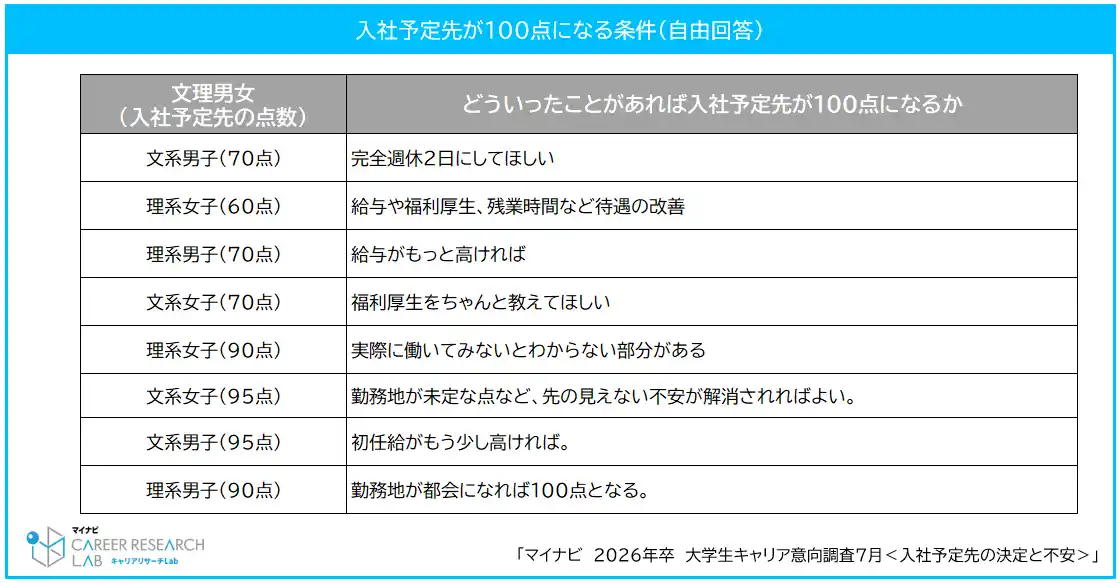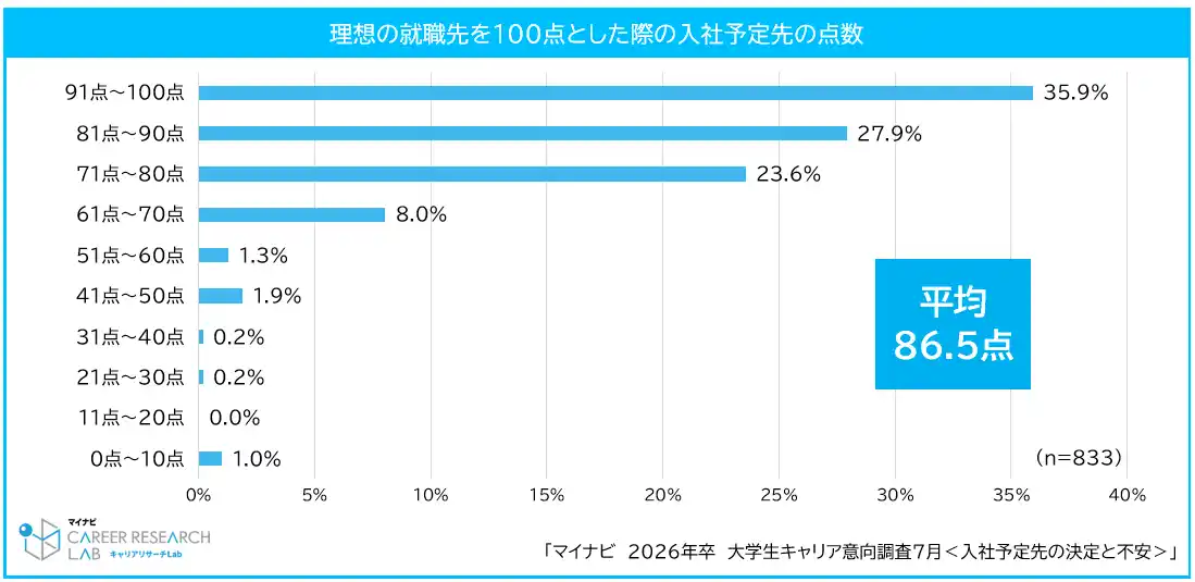 入社予定先の満足度は平均86.5点。勤務地・待遇が満足度を左右入社予定先に不安を感じた学生は56.7%。人事との対話が不安解消の鍵