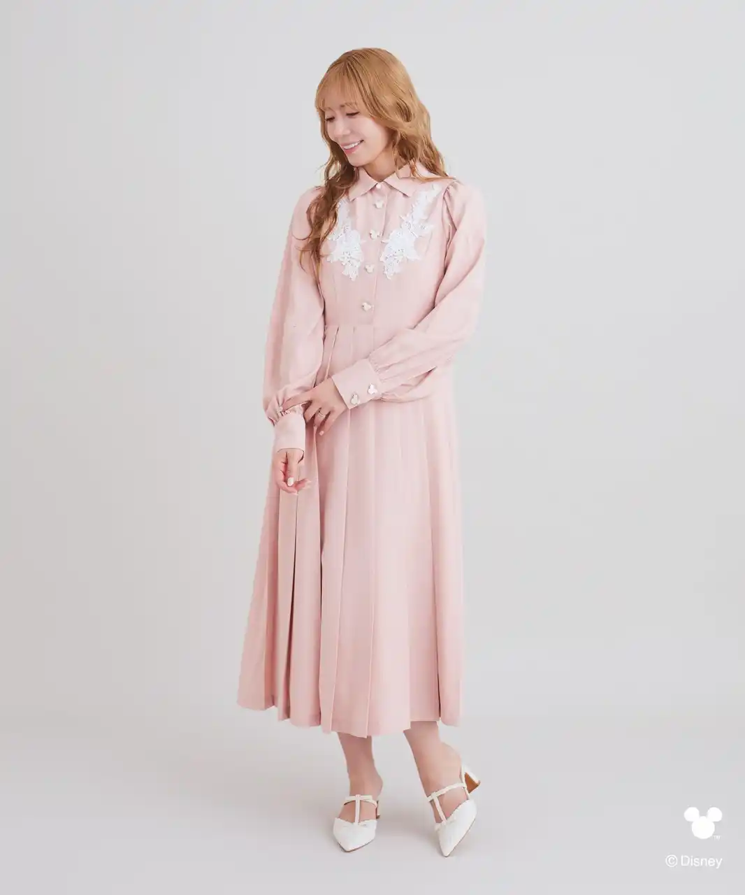アレンジ可能な大きなボウタイリボンが目を惹くシアートップスは、たくさんのミッキーシェイプをドット柄風にデザイン。また、胸元の繊細なレースが上品なプリーツシャツワンピースには、フロントボタンにミッキーシェイプを採用しました。しっかりとした厚手の裏地付きで、秋冬の装いにおすすめです。 |