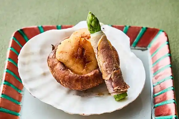 合肴 八色椎茸 帆立貝バター焼き アスパラガス生ハム巻き |