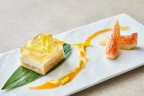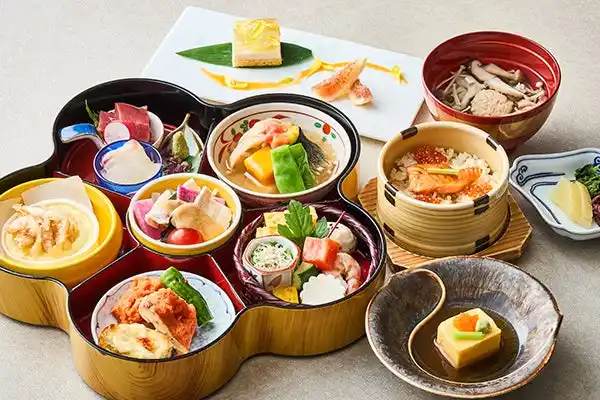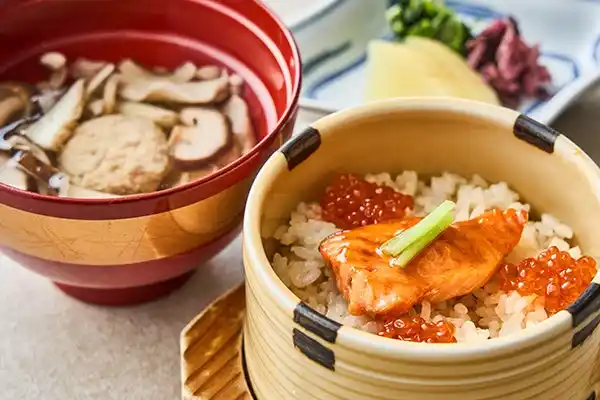 ランチでも、両県の魅力あふれる食材を使用した御膳をご用意いたします。柔らかい肉質と旨み、コクを感じる奥深い味わいが特徴の新潟県産ブランド豚“越後もち豚”のサラダや、新潟県長岡市栃尾地域で作られる、大きく厚みのある油揚げ“栃尾揚げ”をチーズと一緒に焼き、伝統の発酵調味料“かんずり”を合わせた焼物も食べ応えのある一品です。食事では、華やかな見た目と優しい味わいが堪能いただける、日本の伝統的な料理であるわっぱ飯で“信州サーモン”をご提供いたします。信越産のきのこがふんだんに入った“きのこ汁”とともにお楽しみください。 |