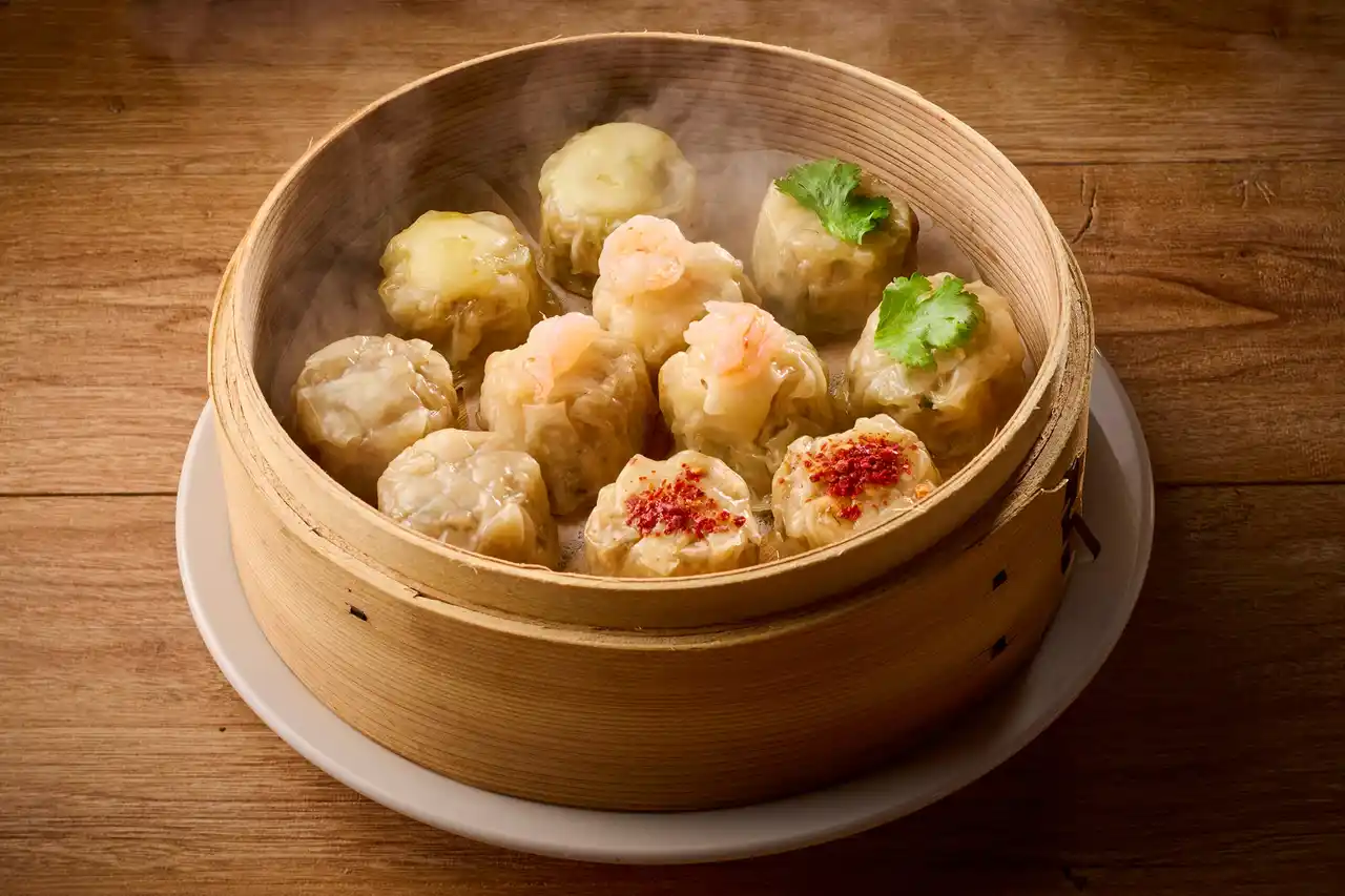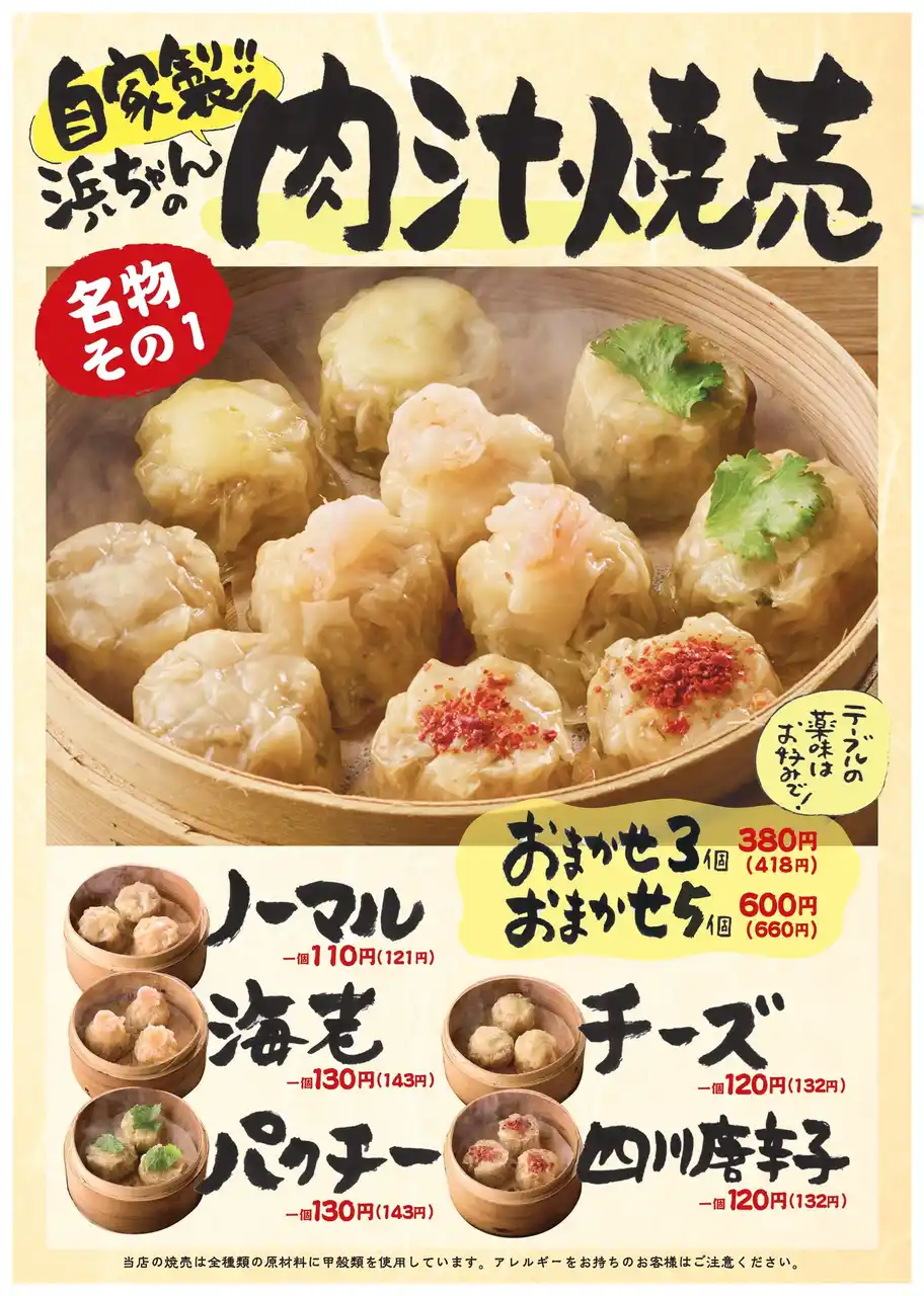 自家製!!浜ちゃんの肉汁焼売:1個110円(税抜)~/テーブルの各種薬味での味変もお楽しみに♪ |