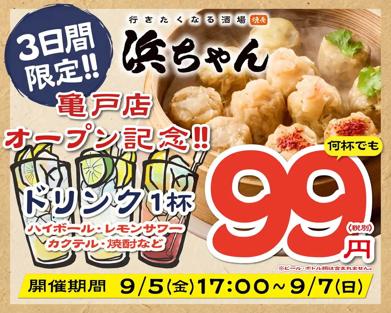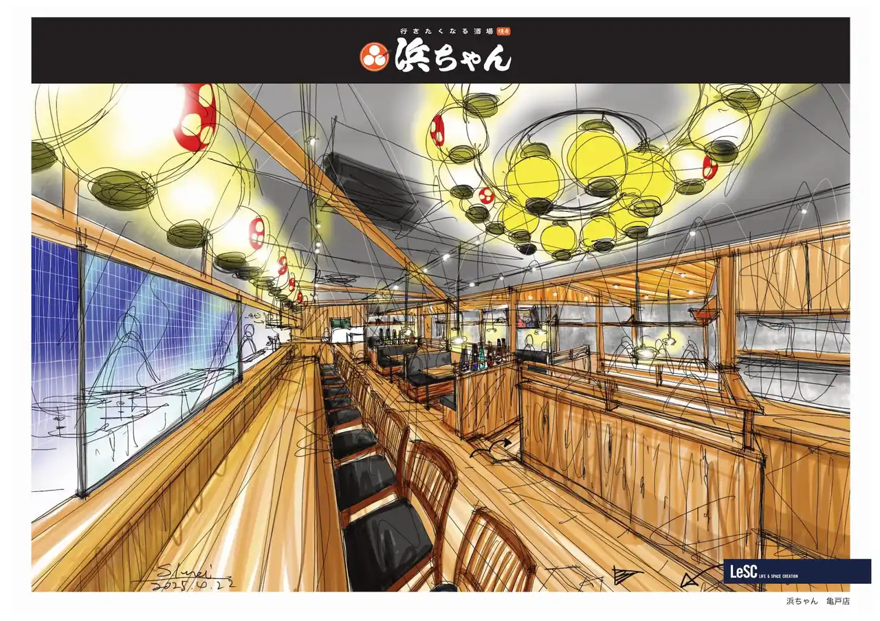 「"楽しい"でつながる世界をつくる」を経営理念とする飲食企業の株式会社ファイブグループ(本社:東京都武蔵野市 代表取締役社長:坂本憲史 以下ファイブグループ)は、2025年9月5日(金)に城東エリアの亀戸にて「行きたくなる酒場 浜ちゃん 亀戸店」をオープンします。 |