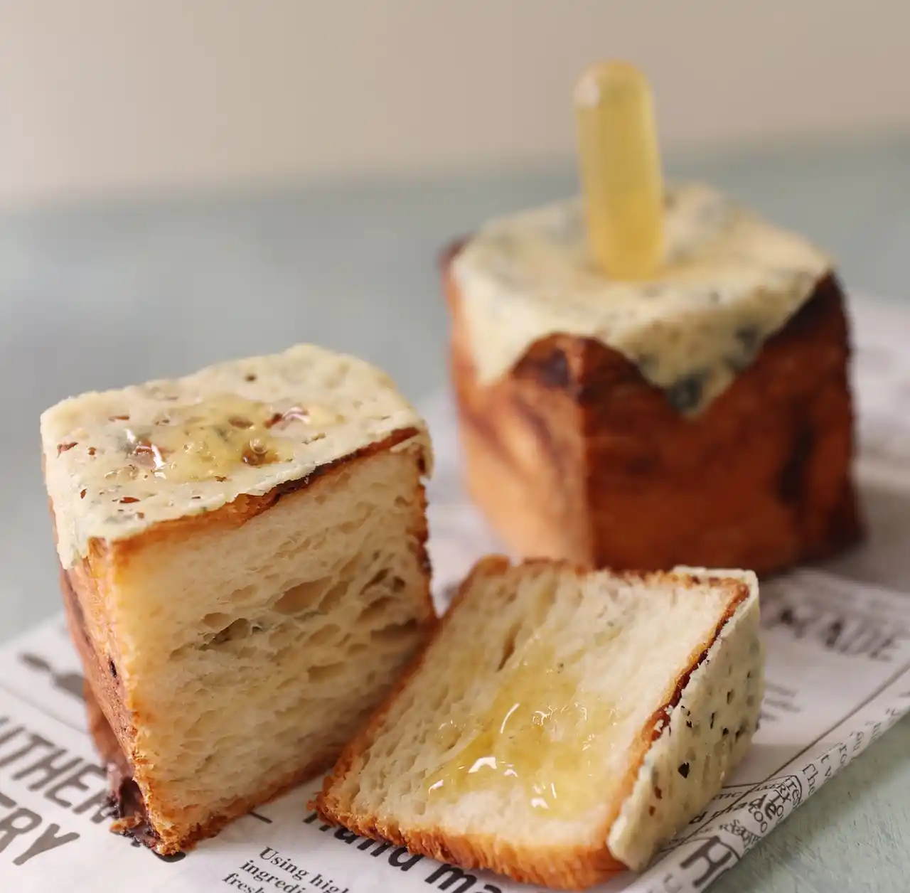商品詳細 :スポイトに詰めた丸の内ハニーと、ブルーチーズの相性抜群の味わいをお楽しみいただけます。ゴルゴンゾーラをクロワッサン生地に折り込んでキューブ状に焼きあげた上に薄いチーズをのせました。スポイドの丸の内ハニーをかけながら、お召し上がりください。 |