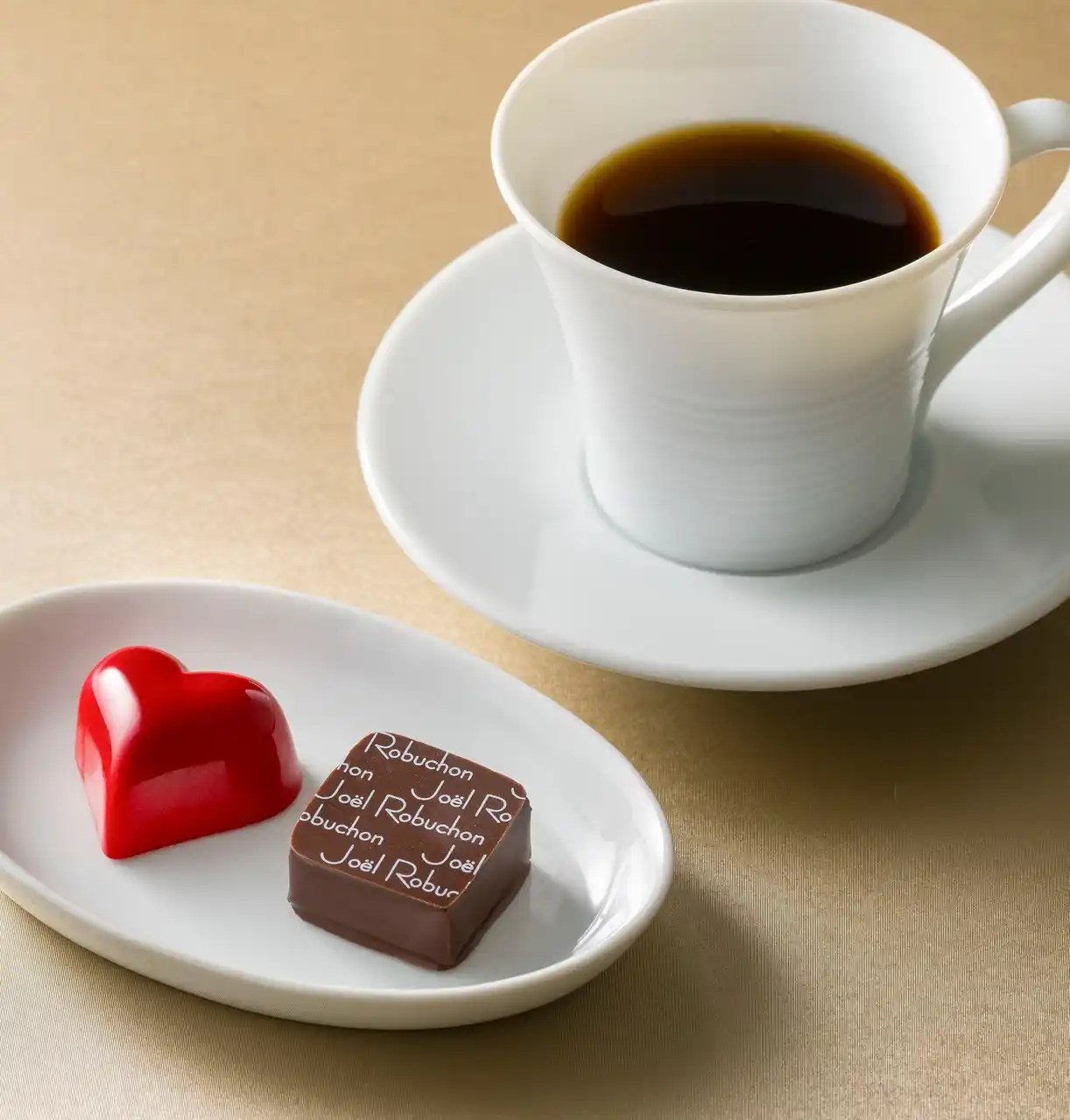 セット内容 :ショコラ2種(フランボワーズ<赤ハート>・ヴァニーユ) ドリンク(コーヒ・紅茶他) |