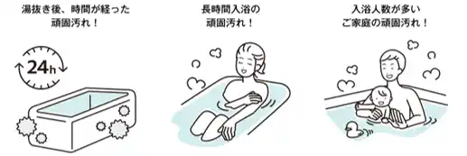 一方、従来の「こすって洗う」方法を続ける人の多くは、湯抜き後の「長時間放置したときの汚れ」や「入浴人数が多い家庭の汚れ」について、「こすらないと落ちない」と認識していることが明らかになりました(※2)。そして実際に、これらの汚れは頑固になっていることが判明しました。 |