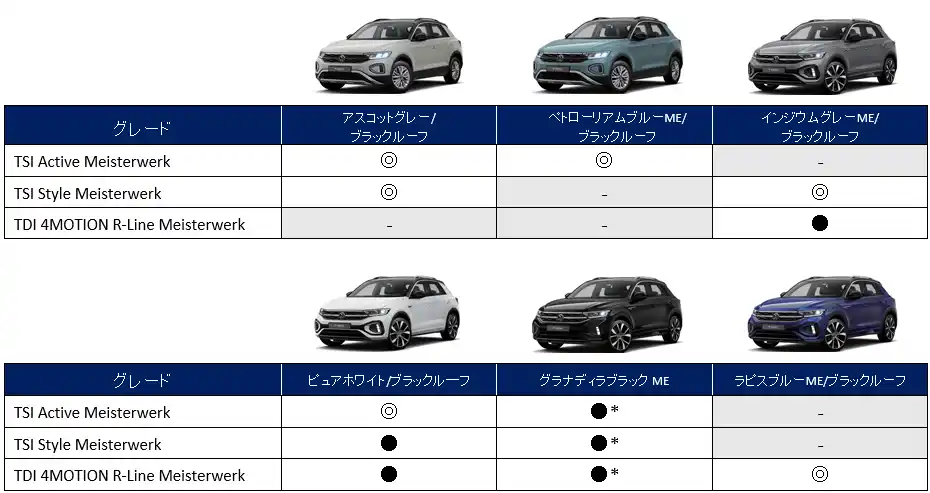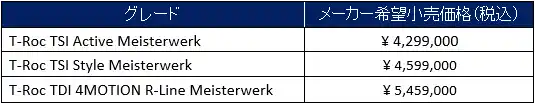 フォルクスワーゲン グループ ジャパン株式会社 (東京都品川区、代表取締役社長:マティアス シェーパース)は、クロスオーバーSUV ”T-Roc”(ティーロック)シリーズの主要グレード”TSI Active”、”TSI Style”および”TDI 4MOTION R-Line”をベースに、装備を充実させながらも魅力的な価格を実現した 特別仕様車”Meisterwerk”(マイスターヴェルク)を設定し、本日より全国のフォルクスワーゲン正規販売店において販売を開始します。 |