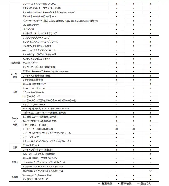 “TDI 4MOTION R-line Meisterwerk”は 従来”R”モデルのみが選択可能だった”ラピスブルーメタリック/ブラックルーフ”の外装色がオプションで選択可能で、さらに19インチアルミホイールが標準装備されます。よりスポーティなエクステリアスタイルを”TDI 4 MOTION”のパワートレインで満喫したいという お客様のご要望に応える待望のモデルです。”TSI Active/ Style Meisterwerk”にはシートヒーター(前席)およびVolkswagen純正インフォテイメントシステム“Discover Pro”が標準装備となり、快適性と利便性の向上が図られています。 |