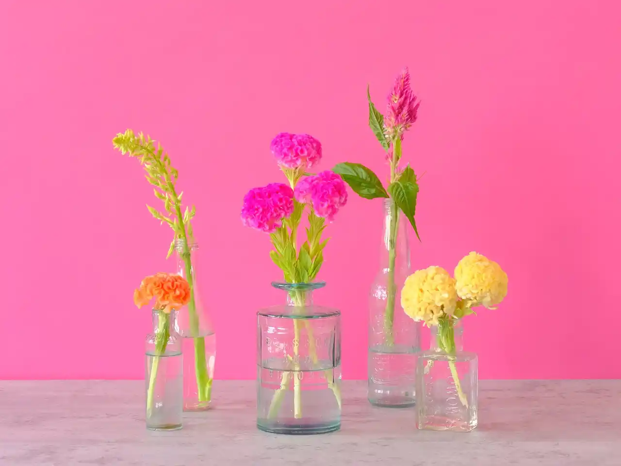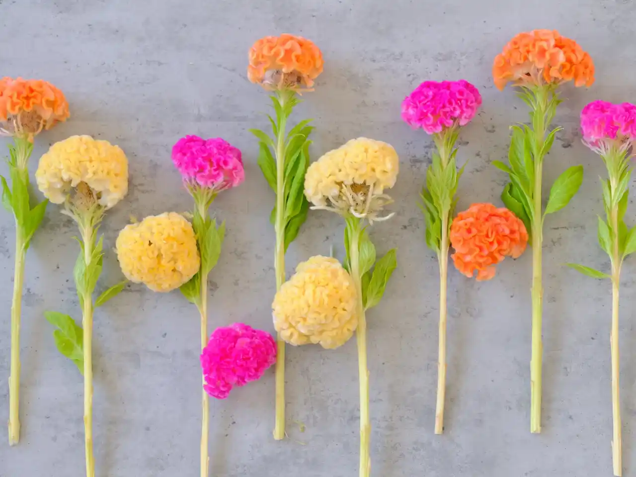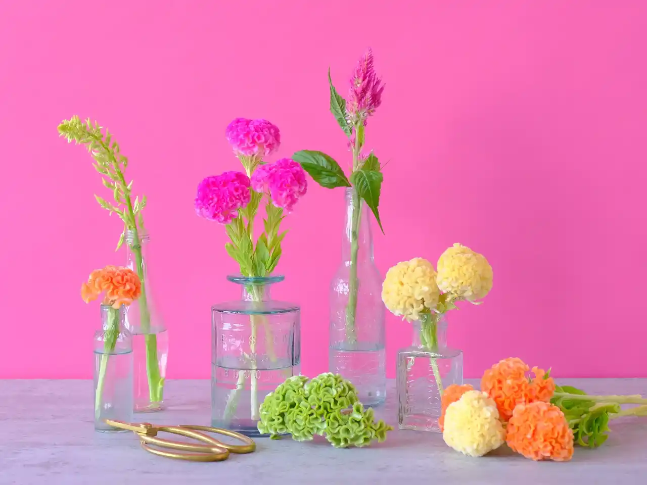 ケイトウは丈夫なので数時間は水につけなくても大丈夫。置くだけの簡単なデコレーションでパーティーシーンを彩りましょう。(葉はしおれやすいのであらかじめ除いておきます。終わったら茎の下をカットして水にいけて楽しみましょう。) |