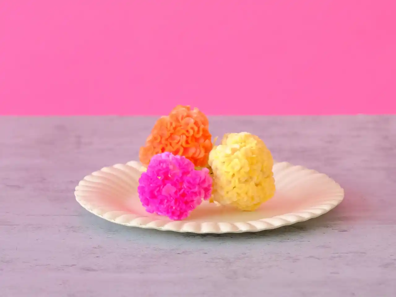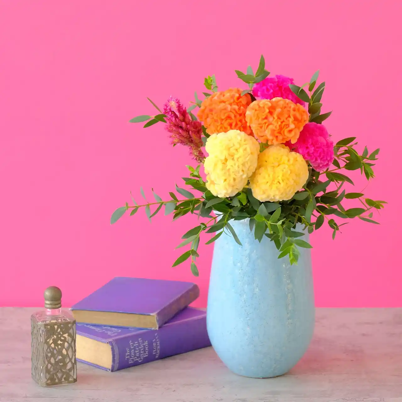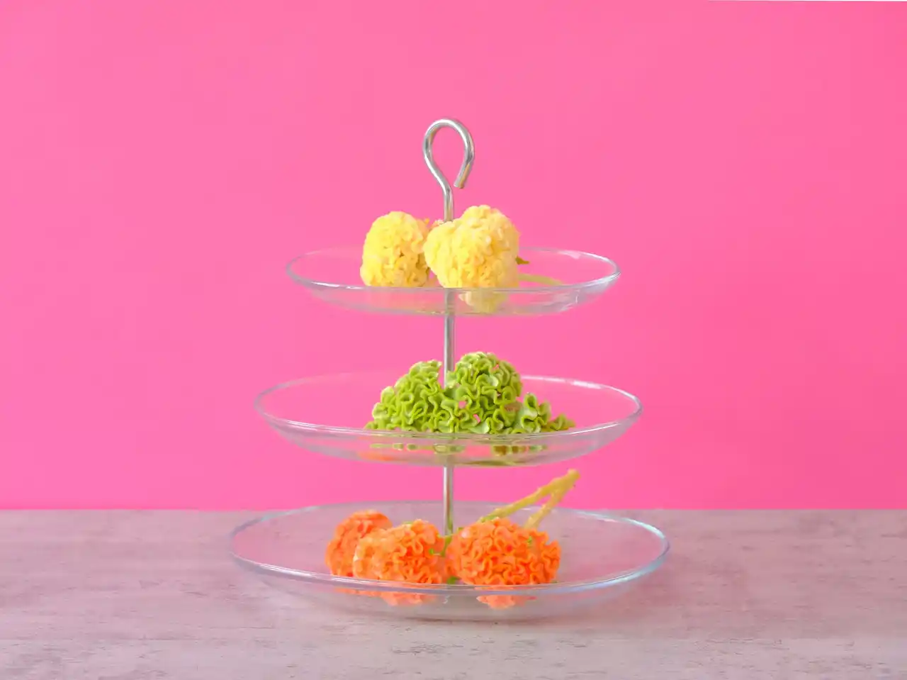 ケイトウは丈夫なので数時間は水につけなくても大丈夫。置くだけの簡単なデコレーションでパーティーシーンを彩りましょう。(葉はしおれやすいのであらかじめ除いておきます。終わったら茎の下をカットして水にいけて楽しみましょう。) |