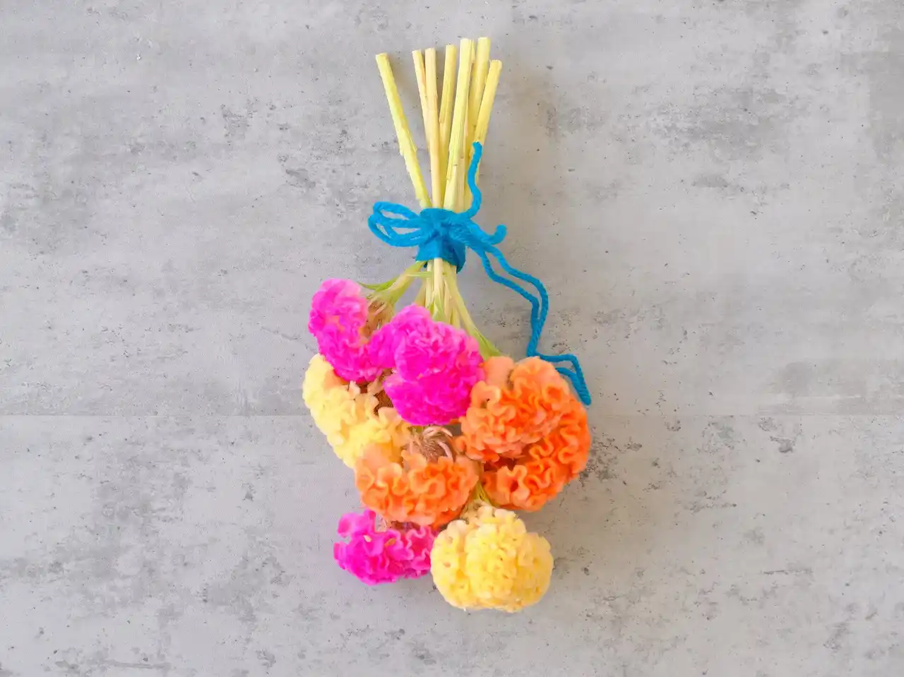 直射日光に当たらない風通しの良い場所に、逆さにしてぶら下げておくと、一週間ほどで色鮮やかなケイトウのドライフラワーができあがります。フレッシュな時とは違う渋めの色合いや風合いの差を楽しんでくださいね。 |