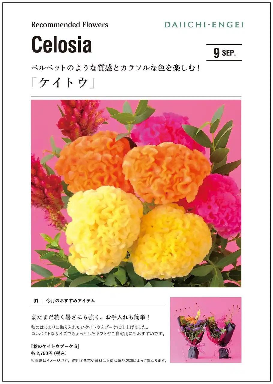 花と緑に関する事業を展開する第一園芸株式会社(本社:東京都品川区、代表取締役社長:山村勝治、三井不動産グループ)は、9月のおすすめの花「ケイトウ」のフェアを9月1日(月)から第一園芸・ビアンカバーネット・エルベシャトランの全店舗で展開します。 |