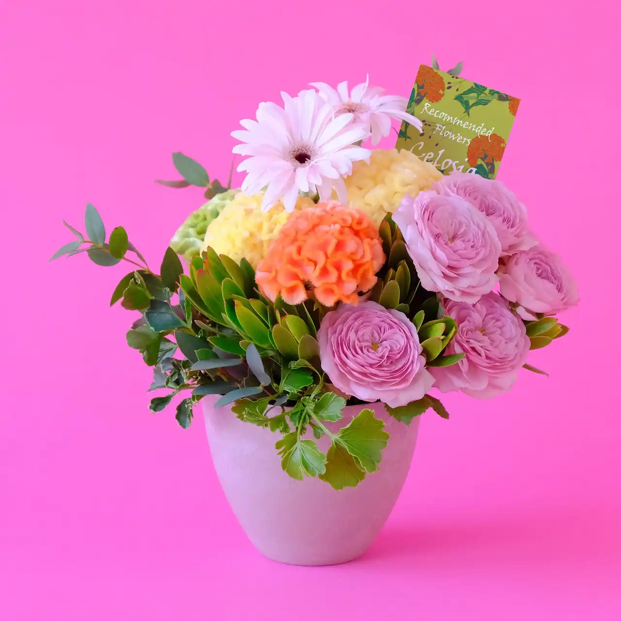 ショップおすすめのケイトウを器にいけた秋らしいアレンジメント。器付きでそのまま飾って楽しめます。 |
