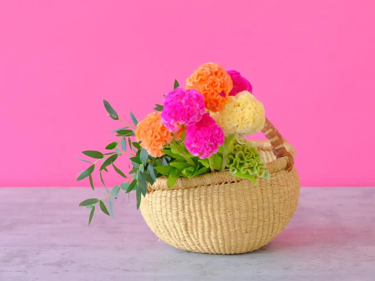 コップなどに入れたケイトウとグリーンをバスケットに入れるだけで、まるでアレンジメントのような花あしらいの出来上がり。 |