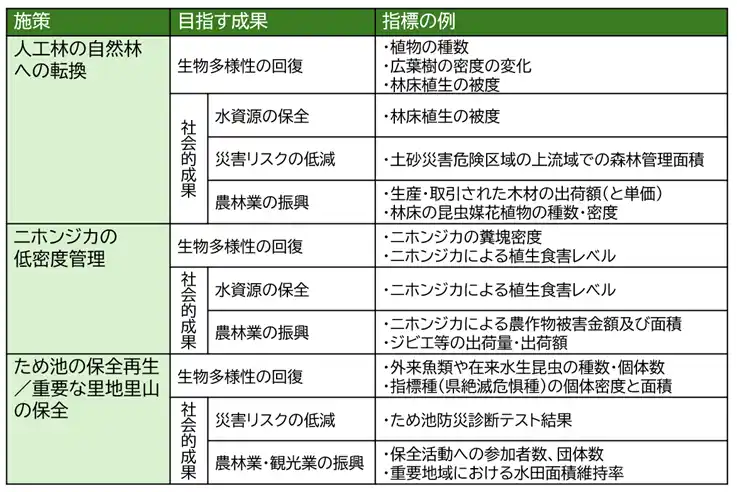 表1. 各施策に応じた生物多様性の回復傾向と社会的成果の評価指標案 |