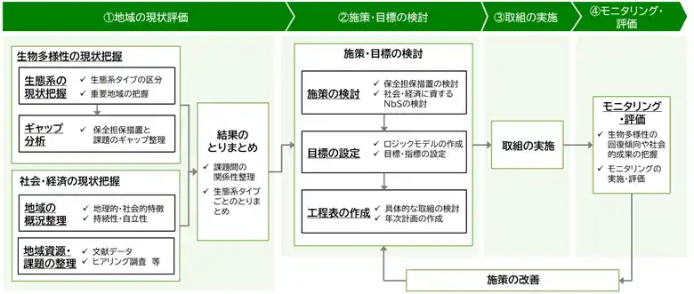 ・生物多様性の保全上の課題と地域の社会課題の双方の解決に資するNbSの施策検討についても具体的な手順や実例を紹介しています。 |